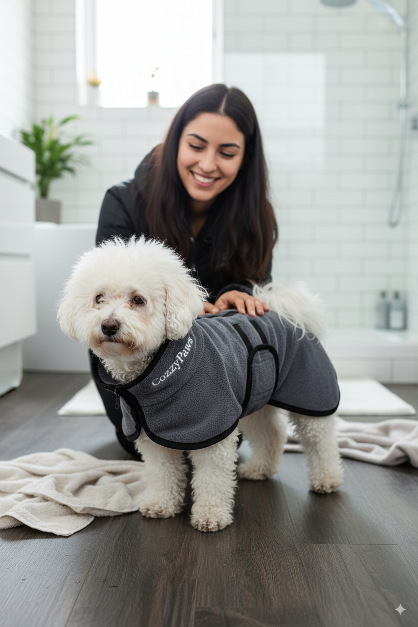 🇲🇦 Première fois au Maroc ! Disponible uniquement chez CozzyPaws. La solution ultime pour sécher votre chien sans mouiller ni salir votre maison, vos sièges de voiture ou vos meubles. Conçu en 100% coton ultra-absorbante, le sac CozzyPaws retient l’humidité, la boue et les odeurs, pour que votre compagnon reste propre et confortable.