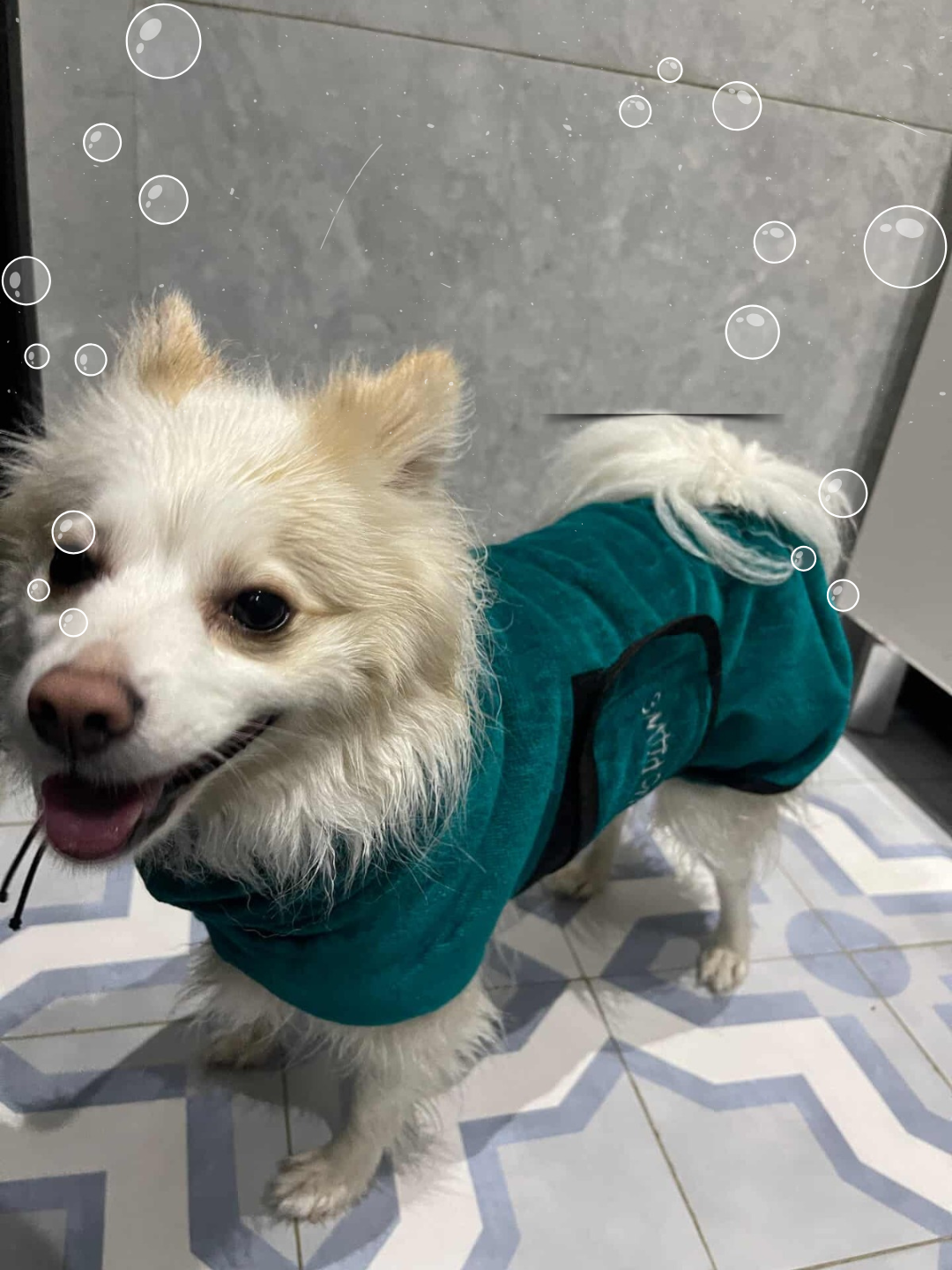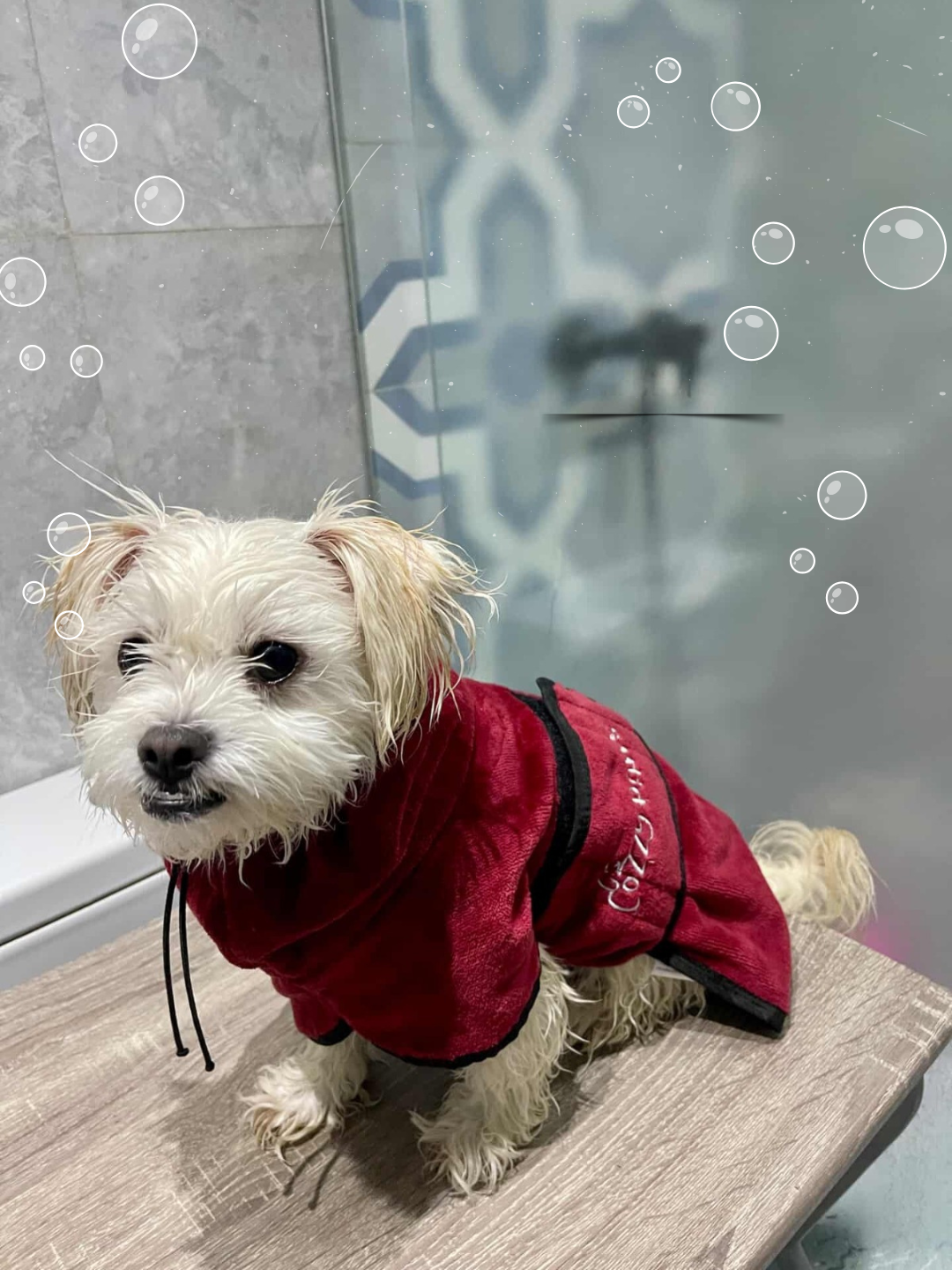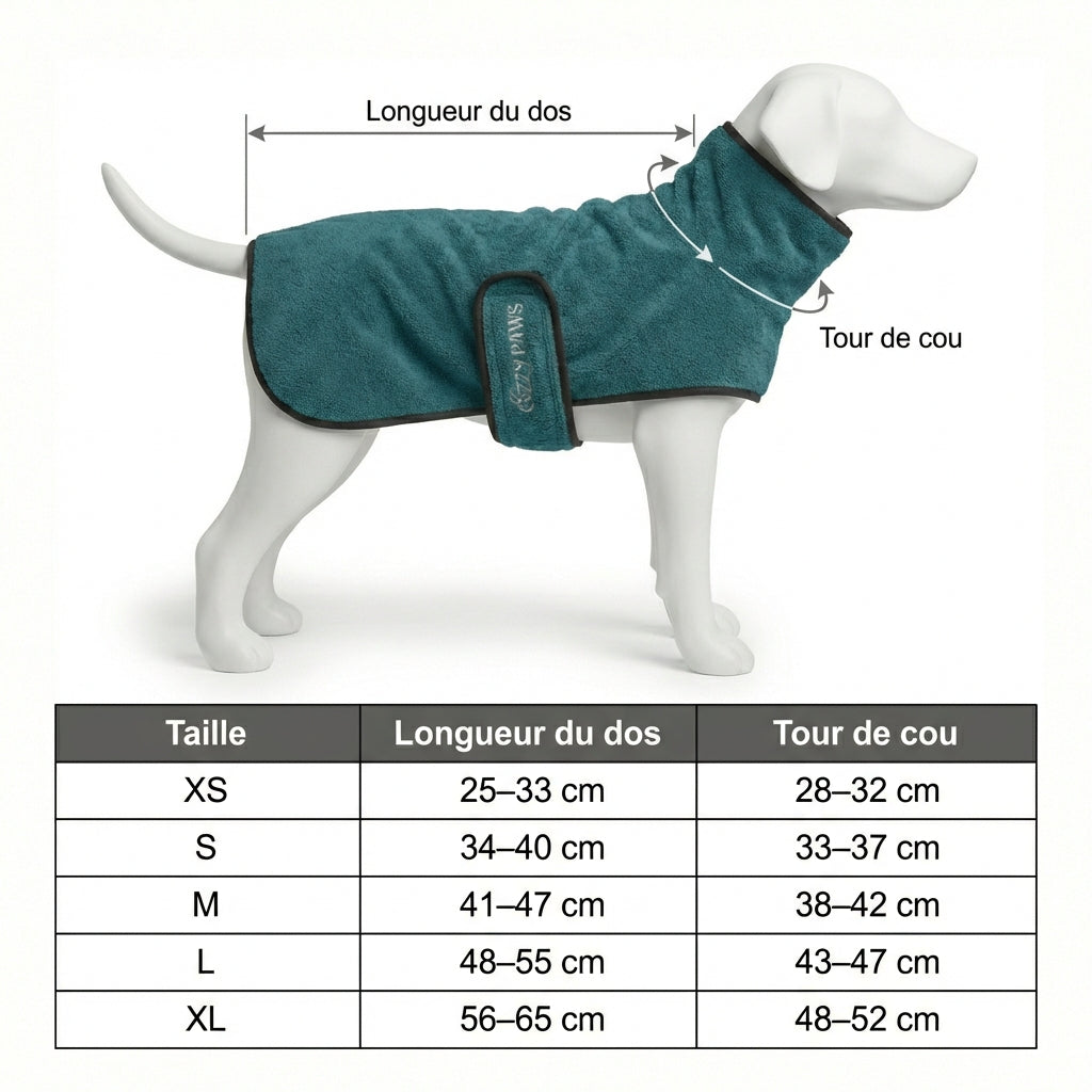C’est un peignoir ultra-absorbant conçu pour être enfilé juste après le bain (ou une sortie sous la pluie). Il aide à absorber l’humidité, garde votre chien au chaud et évite les traces d’eau dans la maison.